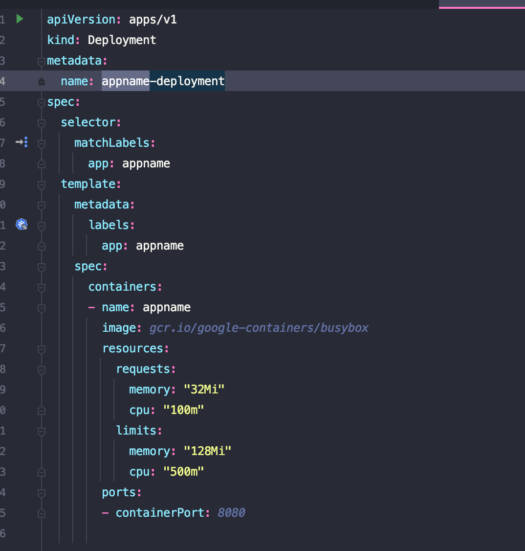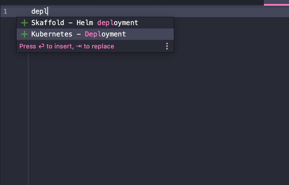 위 스크린샷은 deployment.yaml 파일 작성 시 자동완성 해주는 부분인데, 옵션이 다양하다보니 딱 원하는 대로 생성해주진 않고, 생성 후에 수정이 필요합니다.