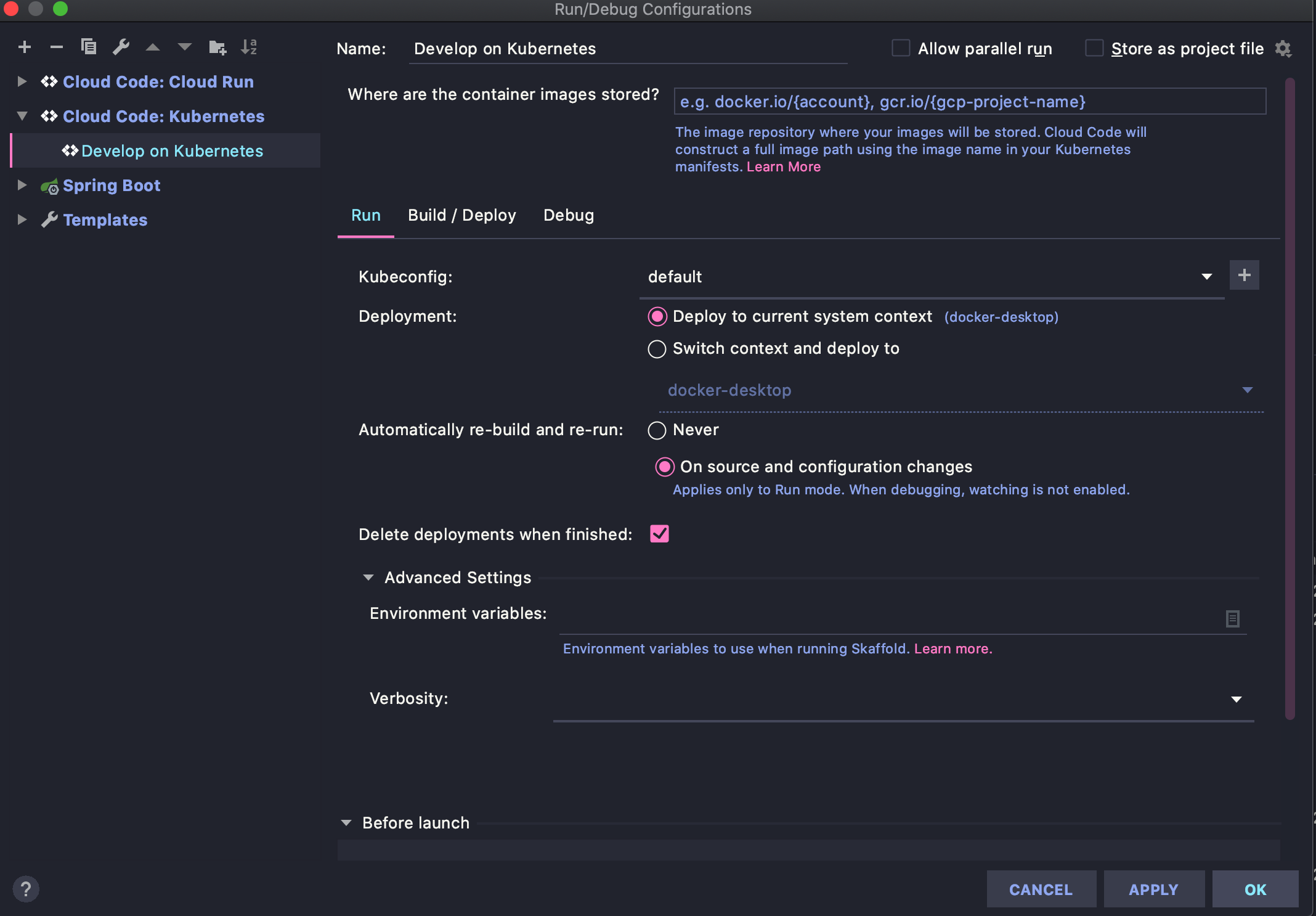 또한 직접 명령어를 수행할 수도 있지만, Cloud Code 의 Run Configuration 을 이용하여 IDE 를 통해 실행하는 것도 가능합니다.