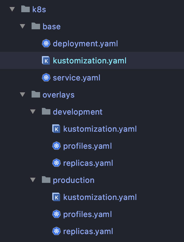 이런 경우에 kustomize 를 사용한다면, base/ 하위 코드로 쿠버네티스를 구성하고, 환경별로 설정을 나누어 관리할 수 있습니다.
