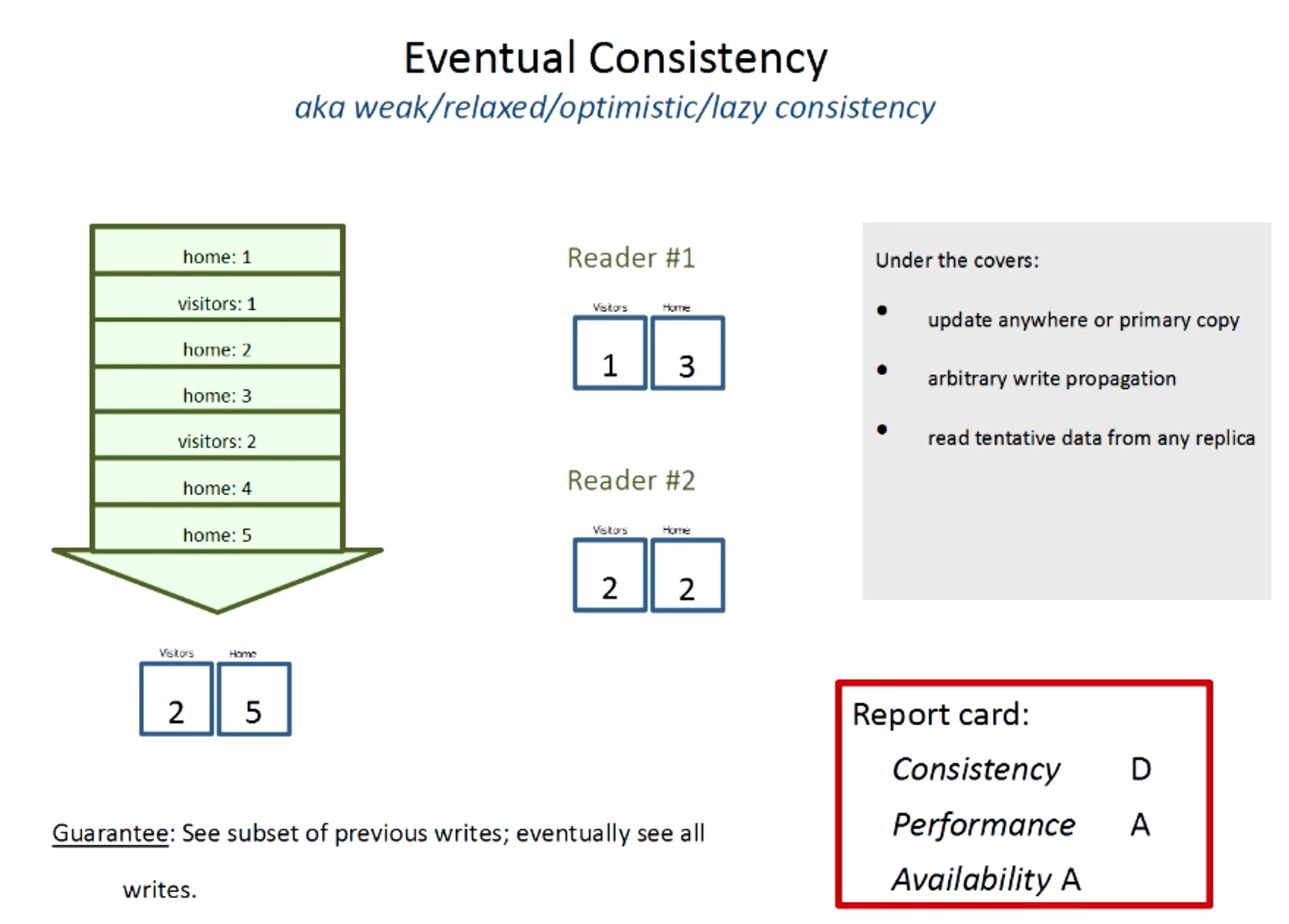 - 가장 약한 일관성을 제공한다. 일시적으로 데이터 불일치가 발생할 수 있다
